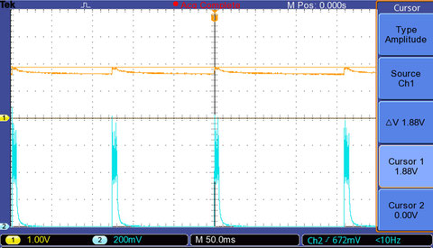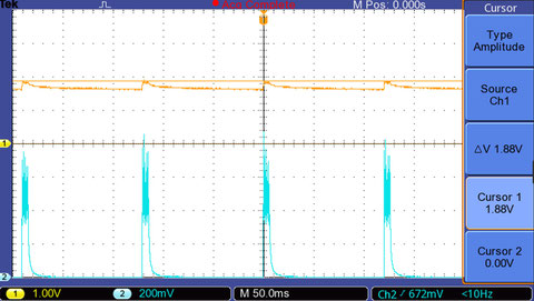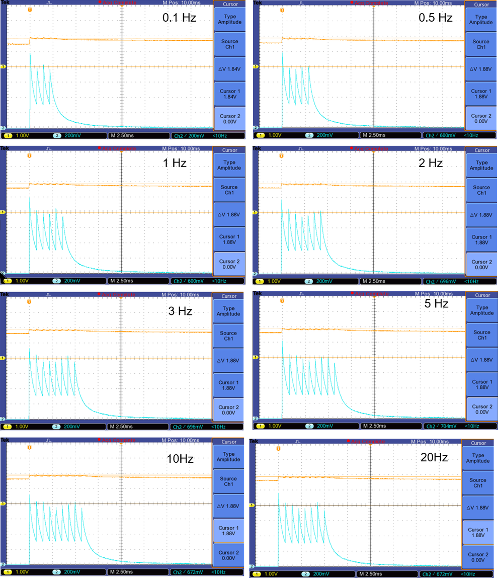 赤色LED(Optosupply社,OSR5PA3133A-1MA,順方向電圧:1.8V,1mA)のパルス列状発光の振動数依存性。Ch1(オレンジ):赤色LEDにかかる電圧の時間変化,Ch2(水色):LEDのパルス列状発光プロファイル(時間軸:2.50ms/div)。