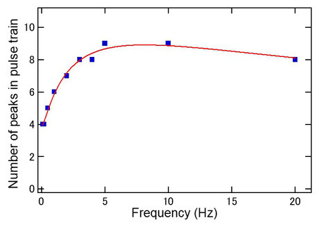赤色LEDのパルス列状発光のピーク数の振動数依存性。