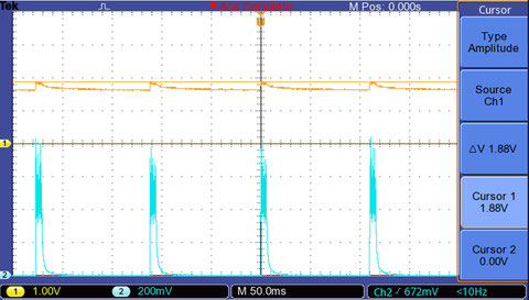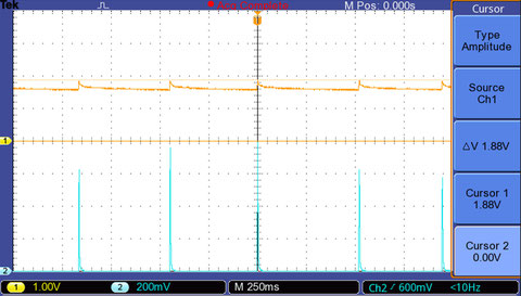 図16-7 振動数1Hzの場合のLEDにかかる電圧(Ch1 オレンジ)とLED発光強度(Ch2 水色,mW換算前の電圧)のオシロスコープトレース