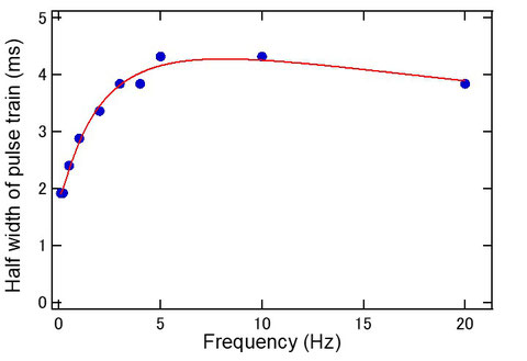 赤色LEDのパルス列状発光の半値幅の振動数依存性。