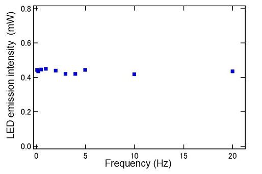 図16-5には,赤色LEDの発光強度(放射強度)に測定に用いたフォトダイオードセンサユニット(浜松ホトニクス,C6386-01)の分光感度特性(Range M)を示した。赤色LEDの発光波長は,625nmであるので,2.208 mV/μWとして,図16-2のオシロスコープのパルス列(Ch2 水色)の最大値から,赤色LEDの最大発光強度(mW)を求めて,図16-6に示した。振動数依存性はなく,ほぼ一定値であった。