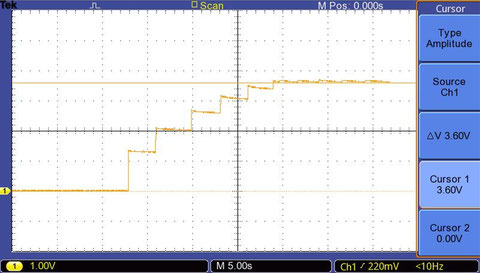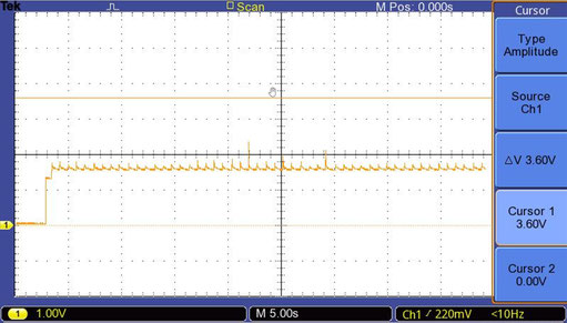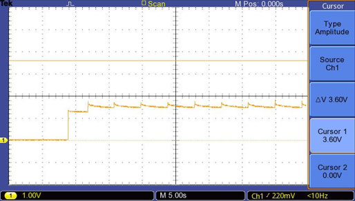 まずは,図6-2のように振動発電モジュール LTC3588の出力電圧Voutを最大電圧のである3.6Vに設定(LTC3588説明書 参照)した場合の,開放電圧(負荷をつながない状態での電圧)のオシロスコープの信号波形を,1Hzおよび5Hzでの振動発電の場合に対して,それぞれ図6-3および図6-4に示した。