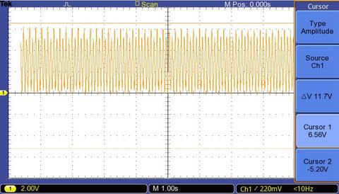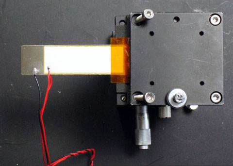 まだ,片側の(押すだけの)振動しか加えられていないし,圧電セラミックス(PZT)層の破壊を心配して,5mmの変位でしか押し込めていない。この時のVppは,約12Vだった。今後,上下対称に振動を加える工夫をしたのちに,さらに変位を大きくし,開放電圧および電流値の測定を行っていく予定である。