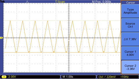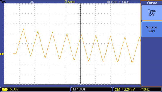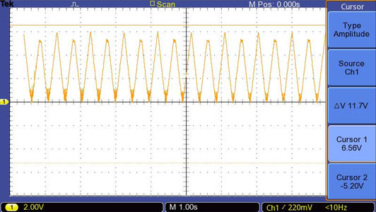 振動発電の振動数を1Hzとして,圧電素子の片側変位を,1mm, 2mm, 3mm, および5mmとした場合の電圧変化を,図8-6, 8-7, 8-8および8-9に,それぞれ示した。変位の増加にしたがって,振動発電の電圧も増加している。片側変位が5mmの振動電圧をブリッジダイオードで整流した波形を,図8-10に示した。