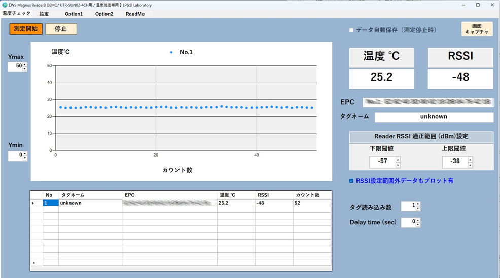 ■ 本ソフトウェアは,温度の変化をセンシングできるICチップを有したUHF帯RFIDセンサータグを用いたワイヤレス計測を目的としたもので,以下の機能を有しています。
