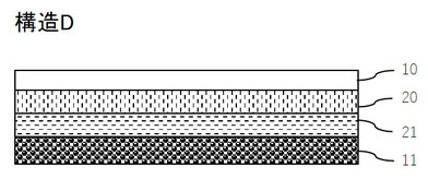 Fig.1 積層型非液体電解質構造を有した亜鉛ヨウ素イオン二次電池の模式図。10:負極(金属電極,Mgに代えてZn),11:正極(カーボン電極), 20:第一非液体電解質層,21:第二非液体電解質層